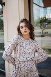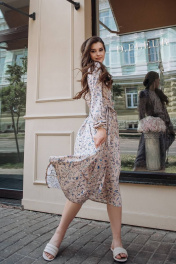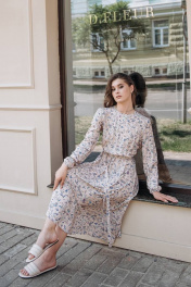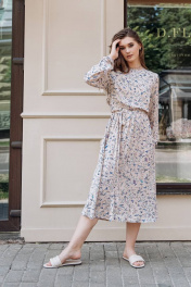 Платье летнее, выполненное из штапеля. А-образный силуэт платья, с подрезом по линии талии и мягкой сборкой по нему. По переду-нагрудные вытачки, в среднем шве спинки у горловины разрез на петельку с пуговичкой. Рукава длинные со сборкой в низу. К платью прилагается поясок из основной ткани. Длина изделия р.42-44 - 120 см, р.46-50 - 121 см, р.52-56 - 122 см Длина рукава р.42-44 - 61 см, р.46-50 - 62 см, р.52-56 - 63 см
