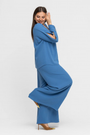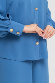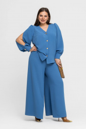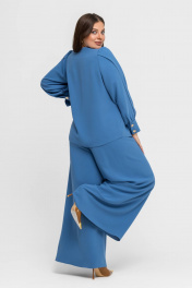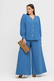 Костюм двухпредметный, состоит из блузки и брюк. Костюм выполнен из блузочной ткани.. Блуза прямого силуэта, длиной до линии бедер. Линия низа изделия фигурная. Застежка по переду центральная на четыре петли и пуговицы. Горловина с V-образным вырезом, по краю борта отрезная планка. Спинка без среднего шва. Рукав втачной, двухшовный с верхним, нижним швами, длинный с манжетой. По верхнему шву в рукаве выполнен разрез. По окату рукава небольшая сборка. Манжета застегивается на 2 пуговицами. Пуговицы в изделии контрастного цвета (золотого). Брюки-юбка широкие с средней посадкой, без бокового шва. Пояс отрезной, на резинке вкруговую. Брюки на подкладке.