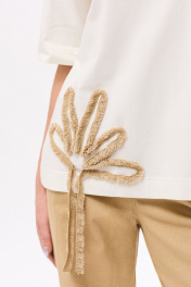 Блузка без воротника, с круглым вырезом горловины. Горловина обработана бейкой. На переде выполнена аппликация в виде бахромы из хлопковой ткани. Рукав втачной, короткий. Силуэт: прямой Вид покроя рукава:.втачной Цветовая гамма для верха, подкладки, фурнитуры, отделки: блузка из трикотажного полотна Тип ткани: трикотажный, костюмно – плательный