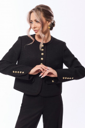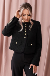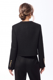 Жакет с центральной застежкой на петли и пуговицы, без воротника, с круглым вырезом горловины. По переду с нагрудными вытачками. На уровне линии талии- настрочные клапаны, зафиксированные к жакету петлей и пуговицей. Низ жакета фигурный. По горловине, краю борта и низу- настрочная планка. Спинка со средним швом. Рукав втачной, длинный со шлицей по локтевому шву и застежкой на петли и пуговицы. По низу рукава и шлице- отрезная планка. Силуэт: полуприлегающий жакет на подкладке