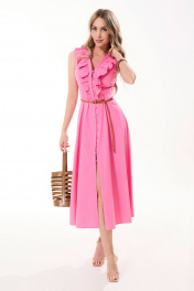 Платье с центральной застежкой на навесные петли и пуговицы по притачной планке, без воротника, без рукавов, с V-образным вырезом горловины. Платье отрезное по линии талии. По лифу переда, вдоль горловины и планки расположена рюша. Лиф спинки с талиевыми вытачками. Нижняя часть спинки со средним швом. По боковым швам расположены шлевки для съемного пояса. Платье со съемным поясом.