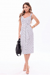 Платье с центральной застежкой на петли и пуговицы, на широких бретелях. Платье отрезное по линии талии. Верхняя часть переда с талиевыми вытачками, нижняя часть переда с карманами и односторонними складками по талии. Нижняя деталь спинки с талиевыми вытачками. Платье со съемным поясом.