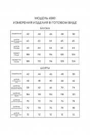 Блузка прямого силуэта, с центральной застежкой на петли и пуговицы , без воротника, с круглым вырезом горловины. По плечевым швам переда- сборка. Рукав втачной, длинный, с резинкой по низу и сборкой по окату. Шорты прямые, без пояса. По верхнему краю шорт- сборка на резинку. В боковых швах расположены карманы. Шорты на подкладке.