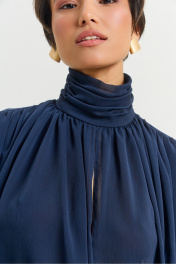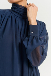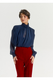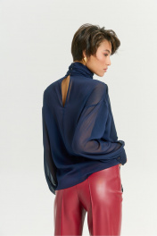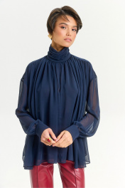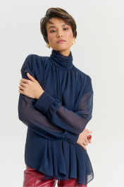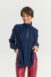Блуза свободного покроя, воротник стойка со сборкой и застёжкой сзади на навесные петли и пуговицы. Прозрачный креп-шифон не ощущается на теле, а чтобы ткань не просвечивала, перед блузы из двух слоёв ткани. Носим блузу навыпуск или заправляем в брюки – складки красиво собираются, акцентируя внимание на рукавах – свободных, с широкими манжетами. Обхват груди: ХS – 91 см, S – 96 см, M – 101 см, L – 106 см. Длина рукава+ плечо: 77 см. Длина изделия по среднему шву спинки 63 см. — Деликатная ручная стирка температура воды до 30°C — Гладить при температуре утюга до 110°C — Не отбеливать — Барабанная сушка запрещена — Сухая чистка (химчистка).