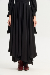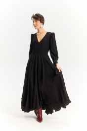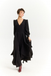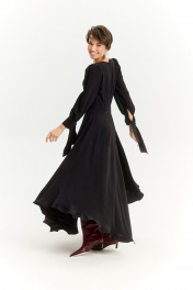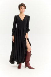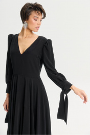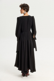 Платье выполнено из вискозной ткани, которая красиво драпируется за счет сложного кроя. Низ изделия асимметричной формы. Женственность образу придают объемные рукава с большими бантами на манжетах. Лиф платья на подкладочной ткани. Модель на фото размера 42/ХS, рост 170 см, размер платья 42/ХS. Обхват груди: XS- 90 см, S- 94 см, M- 98 см, L- 102 см. Обхват талии: XS- 68 см, S- 72 см, M- 76 см, L- 80 см. Ширина плеч: XS- 39 см, S- 40 см, M- 41 см, L- 42 см. Длина рукава с учётом манжеты: 57 см. Длина по спинке: 126 – 127 см. — Деликатная ручная стирка при температуре воды до 30°C; — Гладить при температуре утюга до 110°C; — Не отбеливать; — Барабанная сушка запрещена; — Сухая чистка (химчистка).