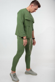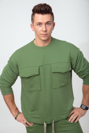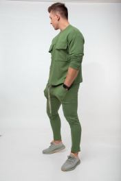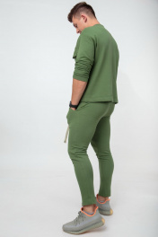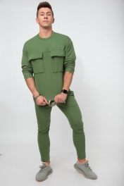 Мужской костюм выполнен из хлопкового футера 3х-нитка. Свободного прилегания свитшот украшен большими накладными карманами с клапанами. По низу вставлена тесьма, как и в поясе брюк, для дополнительной стяжки. Брюки с боковыми карманами, пояс на резинке, к низу заужены. Длина свитшота по спинке 63 см., длина рукава от горловины 76 см. Длина брюк по боковому шву 100 см., по шаговому шву 78 см. Рост модели на фото 183см.