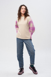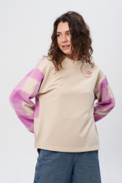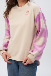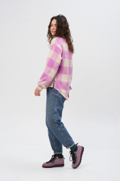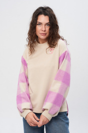 Стильный теплый женский джемпер из качественного футера 3-х нитка и ткани компаньона в крупную клетку (по верху с небольшим ворсом). Джемпер свободного прилегания, плечо приспущено, рукав расширенный, собран на манжету, переход на рукав выполнен из ткани компаньона. По переду украшен съемной брошью. Спинка прямая удлиненная, по бокам небольшие разрезы. Манжеты и горловина из кашкорсе. Джемпер можно с легкостью комбинировать с различными вещами и обувью Вашего гардероба. Длина по спинке от горловины 74 (+-1 см), по переду — 56 (+-1 см), длина рукава от горловины 72 (+-1 см). Рост модели на фото 178 см, размер 44 (S).