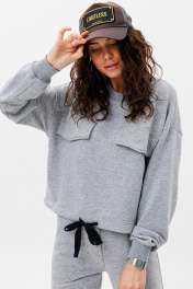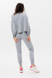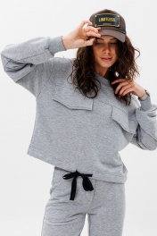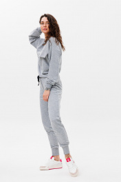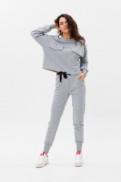 Женский костюм выполнен из хлопкового футера 3х-нитка. Свободного прилегания свитшот украшен декоративными клапанами. По низу свитшота вставлена тесьма, как и в поясе брюк, для дополнительной стяжки. Брюки с боковыми карманами, пояс на резинке, по низу трикотажные манжеты, длину которых можно менять откладывая. Длина свитшота по спинке 53 см., длина рукава от горловины 75 см. Длина брюк по боковому шву 102 см., по шаговому шву 81см. Рост модели на фото 171 см.