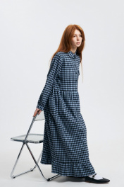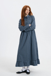 Платье прямого силуэта, отрезное по линии талии. Перед с центральной застёжкой на петли и пуговицы. Воротник стояче-отложной на отрезной стойке с закругленными концами. Рукав втачной, длинный. Низ рукава оформлен манжетой с застёжкой на одну петлю и пуговицу. Расширенная книзу юбка, присобрана в верхней части. В боковых швах карманы. В шов притачивания лифа к юбке в районе боковых швов вставлены узкие пояски, при завязывании которых можно подчеркнуть линию талии. Низ изделия оформлен оборкой. Платье выполнено из мягкой фланелевой хлопковой ткани. Стирка при 30`. Длина изделия - 128 см. Длина рукава - 59 см. Длина рукава с плечевым швом - 74 см. Стирка при t 30 °C.