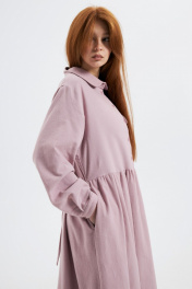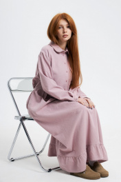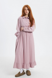 Платье прямого силуэта, отрезное по линии талии. Перед с центральной застёжкой на петли и пуговицы. Воротник стояче-отложной на отрезной стойке с закругленными концами. Рукав втачной, длинный. Низ рукава оформлен манжетой с застёжкой на одну петлю и пуговицу. Расширенная книзу юбка, присобрана в верхней части. В боковых швах карманы. В шов притачивания лифа к юбке в районе боковых швов вставлены узкие пояски, при завязывании которых можно подчеркнуть линию талии. Низ изделия оформлен оборкой. Платье выполнено из мягкой фланелевой хлопковой ткани. Стирка при 30`. Длина изделия - 128 см. Длина рукава - 59 см. Длина рукава с плечевым швом - 74 см. Стирка при t 30 °C.