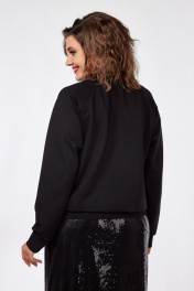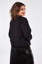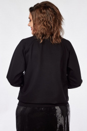 Джемпер женский, выполненный из трикотажного полотна и ткани с пайетками. Вырез горловины V-образный, рукав реглан. По низу рукава - манжет, низ изделия на притачной планке. Перед из ткани в пайетки. Длина рукава от горловины - 71см, длина изделия - 60см.