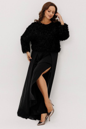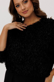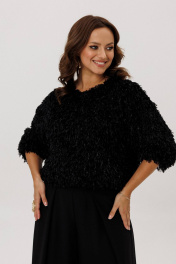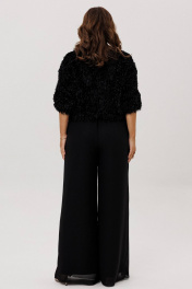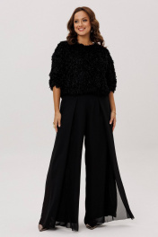 Комплект двойка состоящий из джемпера и брюк. Джемпер свободного силуэта на резинке по низу и рукаве. Вырез горловины округлый, рукав цельнокроеный, застежка по спинке на петлю и пуговицу. Изделие на подкладке. Брюки -палаццо двойные. По талии на резинке, по переду складки и разрезы. Без карманов. Застежка на тесьму молнию по переду.