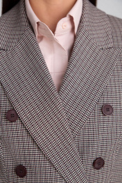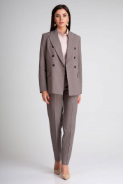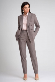 Брючный костюм-двойка, выполнен из костюмного полотна с рисунком "гусиная лапка". Двубортный жакет полуприталенного силуэта, с декоративными пуговицами. Отложной воротник с фигурными лацканами. Перед и спинка с талиевыми рельефами. Спереди горизонтальные карманы с клапанами, в рамку. Спинка со средним швом. Рукава двухшовные. Жакет на подкладке. Брюки со стрелками, заужены к низу. Притачной пояс со шлевками, по спинке сосборен на резинку. Застежка на молнию и пуговицу. Спереди косые боковые карманы. По спинке имитация горизонтальных карманов с листочкой.