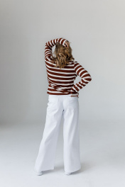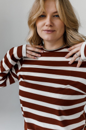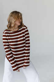 Логслив оверсайз, прямого силуэта с округлой горловиной. Горловина окантована. Плечё приспущено. По переду выполнены нагрудные выточки. Рукав втачной удлененный. Низ изделия и рукава обработаны швом в подгибку с открытым срезом на плоскошовной машине.