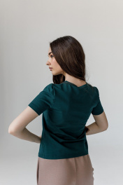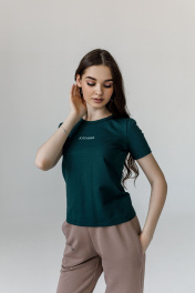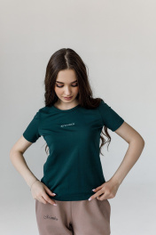 Футболка прилегающего силуэта. Длиной до .. Рукава втачные,короткие. Горловина округлой формы, обработана бейкой. Низ изделия и низ рукава обработаны швом в подгибку с открытым срезом на плоскошовной машине.