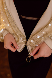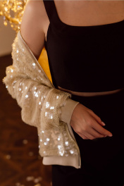 Платье полуприлегающего силуэта, на широких бретелях переходящих в планки по горловинам переда и спинки. Перед с нагрудными и талиевыми вытачками, ниже линии груди вставка из сетки. По синке талиевые вытачками и средний шов. Застежка на потайную тесьму-молнию длиной 45см в среднем шве спинки.