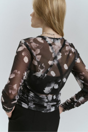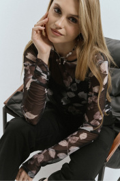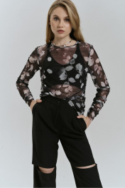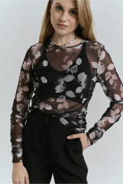 Джемпер молодежный из трикотажного полотна сетка с печатным рисунком прилегающего силуэта,без застежки.с рукавом рубашечного типа длиной до запястья. Перед и спинка со стяжками по боковым швам и драпировкой.Рукав также со сборкой. Длина 63см. Ширина по линии груди 44,46,48см. (42,44,46 рр). Ширина по низу 46,48,50 см. Длина рукава 64см .