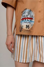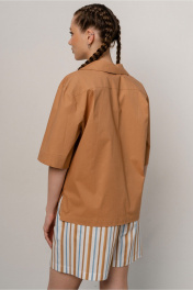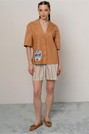 Рубашка жакет прямого силуэта из ткани хлопок,с коротким рукавом рубашечного типа на спущенной линии плеча с воротником пиджачного типа с небольшими лацканами, с центральной застежкой по переду.Отделка принт по полочке снизу. Длина 62см ширина по линии груди 55,5,57,5,59,5см. (42,44,46рр) ширина по талии 55,57,59 см ширина по линии бедер 56,5,58,5,60,5 см соответственно. Длина рукава 29см