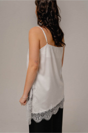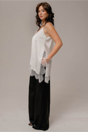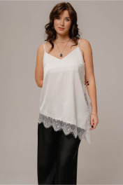 Топ женский молодежный трапециевидного силуэта ,без застежки на регулируемых бретелях из ткани атлас с содержанием хлопка,с отделкой кружевом по низу и разрезу по боковому шву,с ассиметрией по низу. Длина по боковому шву короткого( от плеча) 47 см, длина по боковому шву длинному 67 см ширина на уровне глубины проймы 47,49,51,53см (42,44,46,48рр) ширина по низу 51,53,55,57см, соответственно.