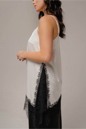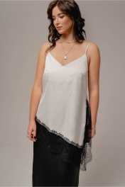 Топ женский молодежный трапециевидного силуэта ,без застежки на регулируемых бретелях из ткани атлас с содержанием хлопка,с отделкой кружевом по низу и разрезу по боковому шву,с ассиметрией по низу. Длина по боковому шву короткого( от плеча) 47 см, длина по боковому шву длинному 67 см ширина на уровне глубины проймы 47,49,51,53см (42,44,46,48рр) ширина по низу 51,53,55,57см, соответственно.