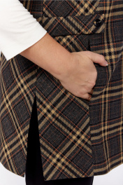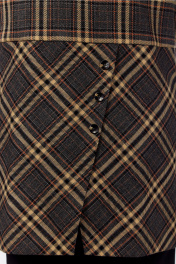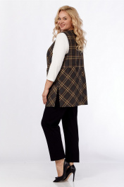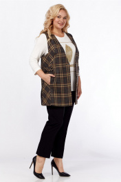 Костюм брючный 3х — предметный, состоит из жилетки, брюк и джемпера. Жилет выполнен из костюмной ткани в клеточку, прямого силуэта. Горловина V-образной формы. Застежка центральная на две петли и пуговицы. По переду фигурные рельефы в которых обработаны карманы. Спинка разрезная по линии талии, нижняя часть спинки с декоративной шлицей. В боковых имеются разрезы и паты переходящие на перед. Брюки классической посадки, заужены к низу. Пояс притачной частично на эластичной тесьме. Застежка на молнию и петлю с пуговицей. По передним деталям брюк обработаны карманы с подрезным бочком. Джемпер выполнен из вискозного полотна. Прямого силуэта. Рукав втачной. Дополнен дизайнерской печатью. Обращаем Ваше внимание, что цвет на экране может отличаться от реального. Описание Длина джемпера по спинке — 59 см, длина рукава — 47 см. р.54 — ПОГ 55 см ПОБ 56 см, р.56 — ПОГ 57 см ПОБ 58 см, р.58 — ПОГ 59 см ПОБ 60 см. Длина жилетки по спинке — 76 см, длина плеча — 10 см. р.54 — ПОГ 59 см ПОБ 62 см, р.56 — ПОГ 61 см ПОБ 64 см, р.58 — ПОГ 63 см ПОБ 66 см. Длина брюк по боковому шву — 97 см. р.54 — ПОТ 45 см ПОБ 58 см, р.56 — ПОТ 47 см ПОБ 60 см, р.58 — ПОТ 49 см ПОБ 62 см.