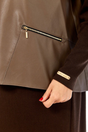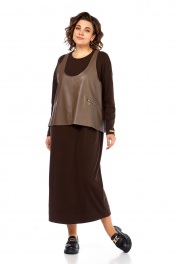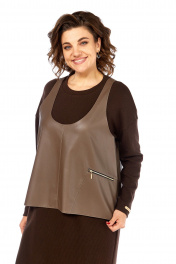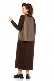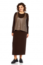 Комплект женский двухпредметный состоит из платья и жилетки. Платье свободного силуэта выполнено из трикотажного полотна ( лапша ). Перед и спинка цельнокроеные. Рукава спущенные. Жилетка выполнена из искусственной кожи на вискозной основе, А — силуэта. Перед со средним швом и асимметричным декоративным элементом. Спинка разрезная по центру. Длина платья по спинке — 127 см, длина плеча + рукав — 73 см. р.50 — ПОГ 51 см ПОБ 54 см, р.52 — ПОГ 53 см ПОБ 56 см, р.54 — ПОГ 55 см ПОБ 58 см, р.56 — ПОГ 57 см ПОБ 60 см. Длина жилетки по спинке — 66 см. р.50 — ПОГ 54 см ПОБ 67 см, р.52 — ПОГ 56 см ПОБ 69 см, р.54 — ПОГ 58 см ПОБ 71 см, р.56 — ПОГ 60 см ПОБ 73 см.
