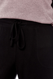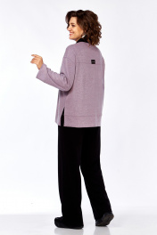 Костюм брючный двухпредметный выполнен из трикотажного полотна, состоит из джемпера и брюк. Джемпер свободного силуэта. По переду обработана оригинальная деталь с застежкой на тесьму-молнию. Спинка на кокетке. В боковых швах обработаны разрезы. Рукава спущенные длинные. Изделие дополнено декоративными нашивками. Брюки прямого силуэта, с притачным поясом на эластичной тесьме. В передних деталях брюк обработаны карманы. Длина джемпера по спинке — 69 см, длина плеча + рукав — 74 см. р.52 — ПОГ 57 см ПОБ 59 см, р.54 — ПОГ 59 см ПОБ 61 см, р.56 — ПОГ 61 см ПОБ 63 см, р.58 — ПОГ 63 см ПОБ 65 см. Длина брюк по боковому шву — 109 см. р.52 — ПОТ 38 см ПОБ 55 см, р.54 — ПОТ 40 см ПОБ 57 см, р.56 — ПОТ 42 см ПОБ 59 см, р.58 — ПОТ 44 см ПОБ 61 см.