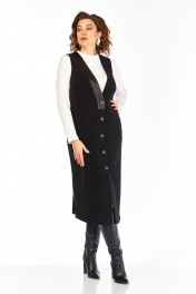 Сарафан прямого силуэта из трикотажного полотна с имитацией вельвета. Горловина V -образной формы с отделкой из экокожи. Застежка центрально — бортовая на петли и пуговицы. По переду нагрудные вытачки и обработаны карманы с листочками. На спинке фигурный вырез. Сарафан на подкладке. Длина сарафана по спинке — 118 см. р.52 — ПОГ 58 см ПОБ 60 см, р.54 — ПОГ 60 см ПОБ 62 см, р.56 — ПОГ 62 см ПОБ 64 см, р.58 — ПОГ 64 см ПОБ 66 см.