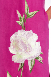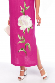Платье женское прямого силуэта, изготовлено из натуральной ткани. Горловина круглой формы. По переду обработаны нагрудные вытачки. На спинке средний шов. В боковых швах обработаны карманы, внизу разрезы. Рукава втачные, разрезные с фигурным вырезом. Платье декорировано дизайнерской вышивкой. Длина платья по спинке — 129 см, длина рукава — 25 см, длина плеча — 11 см. р.52 — ПОГ 57 см ПОБ 60 см, р.54 — ПОГ 59 см ПОБ 62 см, р.56 — ПОГ 61 см, ПОБ 64 см, р.58 — ПОГ 63 см, ПОБ 66 см.