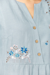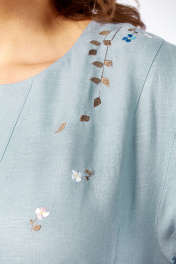 Платье женское, свободного силуэта выполнено из натуральной ткани. Горловина фигурной формы. Платье отрезное по линии талии и слегка присобрано. В верхней части переда обработана имитация застежки на запах. Линия плеча слегка спущена. Рукава с отложными манжетами. В боковых швах обработаны карманы. Изделие дополнено дизайнерской вышивкой. Длина платья по спинке — 119 см, длина плеча + рукав — 41 см. р.50 — ПОГ 55 см ПОБ 65 см, р.52 — ПОГ 57 см ПОБ 67 см, р.54 — ПОГ 59 см ПОБ 69 см, р.56 — ПОГ 61 см ПОБ 71 см, р.58 — ПОГ 63 см ПОБ 73 см, р.60 — ПОГ 65 см ПОБ 75 см.