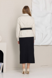 Стильная куртка светлого оттенка, возможно, бежевого или кремового. Куртка имеет прямой крой и длинные рукава с манжетами на пуговицах. Отложной воротник придает ей классический вид, а завязывающийся на талии черный пояс создает акцент на фигуре. Застежка на пуговицы остается скрытой, что придает куртке лаконичность. Куртка выглядит элегантно и универсально, подходя как для офиса, так и для повседневных образов.Длина изделия-61см, длина рукава-57 см