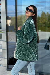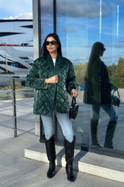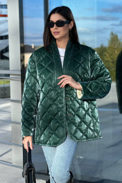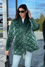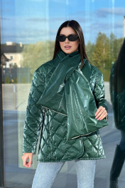 Зелёная стёганая куртка сразу привлекает внимание своим необычным оттенком и глянцевой текстурой. Куртка имеет прямой силуэт и длину до бёдер, что делает её удобной и практичной. Стёжка выполнена ромбами, придавая куртке объём и интересный визуальный эффект. В комплекте с курткой идёт шарф из той же ткани, который можно носить разными способами. Этот комплект создаёт стильный и современный образ, подходящий для прохладной погоды.Длина изделия-72 см, длина рукава-52 см