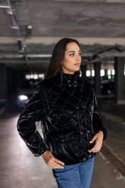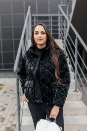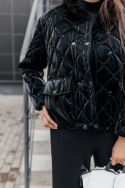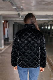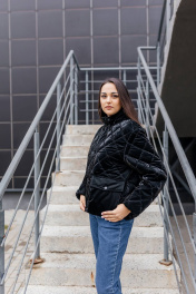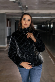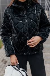 Чёрная стёганая куртка, излучающая элегантность и стиль. Куртка имеет ромбовидный рисунок стёжки, что придаёт ей текстуру и объём. Высокий воротник-стойка защищает от ветра и создаёт элегантный силуэт. Застежка на пуговицы добавляет куртке классический вид, а её длина до бёдер делает её практичной и удобной. Куртка выглядит теплой и комфортной, идеальной для прохладной погоды.Длина изделия-65см, длина рукава-50 см