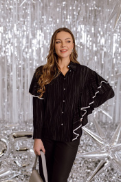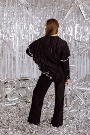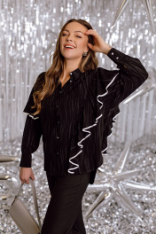 Черная блузка украшенная волнистой отделкой придаст образу изысканнность и оригинальность. Модель имеет длинные рукава с манжетамии классический воротник. Ткань легкая струящаяся, создающая элегантный силуэт. Отлично подходит для создания стильного и современного образа.