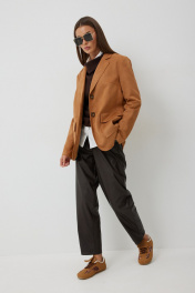 Брюки женские из искусственной кожи зауженные к низу. На передних частях брюк обработаны карманы с отрезным бочком и застрочены складки. По концам кармана установлены хольнитены. По спинке брюк накладные карманы с хольнитенами на концах и отрезной кокеткой. Верхний срез брюк обработан отрезным поясом со шлевками. Брюки застегиваются по переду на «молнию» в гульфике и кнопку по поясу.