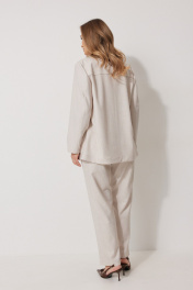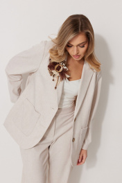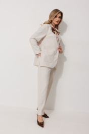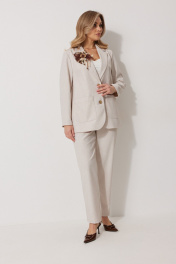 Костюм женский состоящий из жакета и брюк. Жакет прямого силуэта на частичной подкладке длиной за линию бедра. По переду жакета застрочена наклонная нагрудная вытачка. В нижней части полочки располагается накладной карман. Спинка прямая с отрезной кокеткой. В боковых швах располагаются глубокие шлицы. Горловина обработана втачным воротником с лацканами пиджачного типа. Застежка центральная, однобортная на петли пуговицы. На лацкане съемная авторская брошь. Брюки зауженные к низу. По переду Обработана застежка на «молнию» и наклонные карманы с отрезным бочком. Верхний срез брюк обработан притачным поясом на частичной резинке.