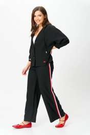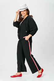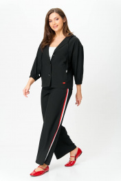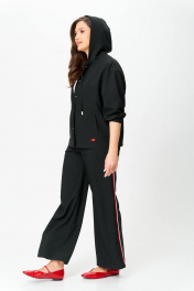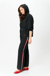 Комплект выполнен из текстильного полотна с содержанием льна. Состоит из куртки и брюк. Куртка прямого силуэта. Линия плеча спущена. Низ рукава обработан манжетой на резинке. Куртка с капюшоном. Застежка центральная на петли и пуговицы. По переду выполнены карманы с листочкой. Спинка с горизонтальным швом, прямая, без особенностей. Брюки прямые. Пояс приточной, частично на резинке. Застежка гульфик. По боковым швам настрочена декоративная тесьма.
