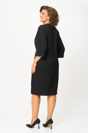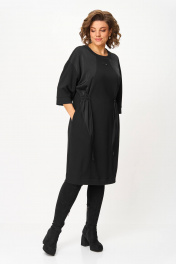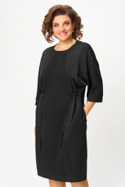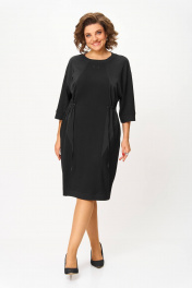 Платье женское, выполнено из трикотажного полотна с декоративными вставками из сатина в цвет основного полотна. Силуэт прямой, приталенный за счёт кулисы по передней части платья. Покрой свободный, линия плеча спущена. Рукав длиной чуть ниже локтя. Низ рукава декорирован трикотажным довязом и выточками. Горловина овальная, обработана довязом. По центру в верхней части переда декоративная нашивка . По переду вертикальные подрезы, декоративные выточки. Карманы в боковых швах. Спинка прямая со средним швом. Платье без застёжки, без подкладки.