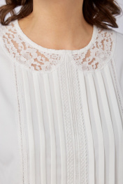 Блуза женская прямого силуэта с коротким цельнокроенным рукавом, оформленным притачной манжетой. Перед с застроченными складками и настроченным кружевом по центру и рельефным швам. Спинка с цельнокроенной планкой-застежкой на петли и пуговицы. По горловине переда и спинки вставлены отрезные кружевные воротнички. Разрезы по бокам. Длина спинки: 62см.