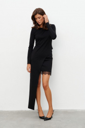 - ОписаниеКомплект имитирующие платье из трикотажного полотна состоящий из джемпера с асимметричным низом и мини-юбки с кружевом. Джемпер прилегающего силуэта с длинным рукавом, вырез горловины - лодочка. Юбка на резинке по поясу. По низу настрочено тонкое кружево. Длина по середине спинки 42-48р -140 см Длина юбки 42-44р -43 см 46-48р - 45 см Длина рукава 42-44р -62,5см 46-48р - 63 см