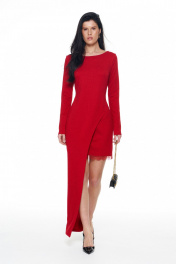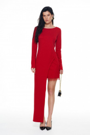Комплект имитирующие платье из трикотажного полотна состоящий из джемпера с асимметричным низом и мини-юбки с кружевом. Джемпер прилегающего силуэта с длинным рукавом, вырез горловины - лодочка. Юбка на резинке по поясу. По низу настрочено тонкое кружево. Длина по середине спинки 42-48р -140 см Длина юбки 42-44р -43 см 46-48р - 45 см Длина рукава 42-44р -62,5см 46-48р - 63 см