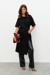 Комплект из трикотажного полотна состоящий из платья-туники и шорт. Платье со спущенным плечом и рукавом до локтя, горловина отделана эластичной бейкой. Сбоку, чуть ниже талии, конструктивный элемент в виде узла, переходящего в высокий разрез. Через узел протянуто декоративное золотое кольцо. Шорты плотно прилегающие на резинке по поясу. Длина по середине спинки 44-48р -112,5 см 50-54р -113 см Длина рукава 44-54р -20 см
