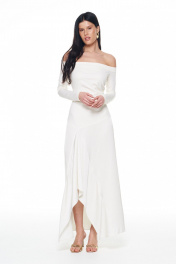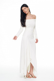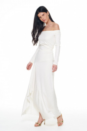 Платье длины макси выполнено на сочетании мягкого, трикотажного полотна и струящегося атласа. Лиф изделия без плечей плотно держится на фигуре засчёт плотного прилегания. По переду в области талии заложены складки. Атласная юбка асимметричная с большим расклешением. Длина изделия 42-46р - 124см; Длина рукава 42-46р - 54.5см.