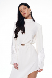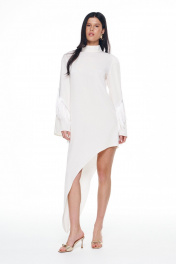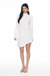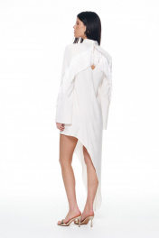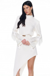 Платье-трансформер из струящейся атласной ткани с асимметричным низом и бахромой по рукавам и спине. Горловина-стойка с застёжкой на пуговицы сзади с V-образным вырезом. Удлинённая часть юбки имеет петельку, которую можно поднять вверх и зафиксировать ну пуговицу в боковом шве на талии. Комплектуется съёмным ремнём. Длина изделия по боковому шву по правой стороне: 42-48р - 110см по левой стороне: 42-48р - 45см. Длина рукава: 42-48р - 63см.