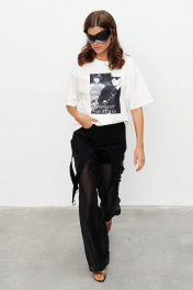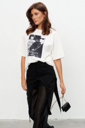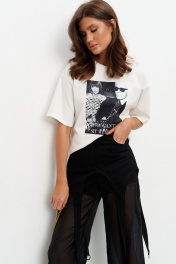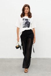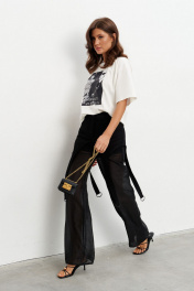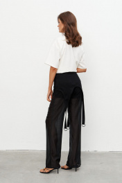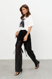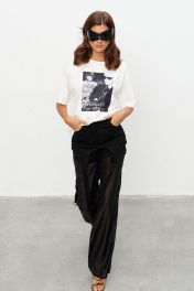 Брюки прямого силуэта с баской выполнены на сочетании плотного джинса и полупрозрачной вискозной вуали. Брюки на поясе со шлёвками и застёжкой на пуговицу-болт и молнию. Чуть ниже шва сидения идут подрезы имитирующие по форме мини-шорты. От подрезов вниз брюки выполнены из вуали. По переду два прорезных кармана, по спинке - два накладных. Длина брюк от талии 42-42р - 112 см 46-48р - 112,5см