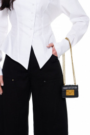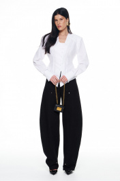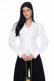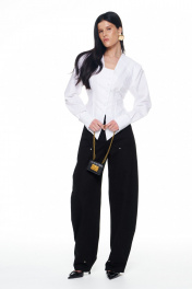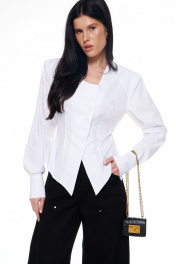 Приталенная рубашка с объёмными плечами и расклешённым низом с эффектом баски. Рукав длинный на манжете. Вырез горловины глубокий со смещённой застёжкой на пуговицы. В боковых швах завязки, которыми можно затянуть изделие по талии и завязать на бант сзади. Длина изделия по середине спинки: 42-44р - 57см; 46-48р - 58см. Длина рукава: 42-44р - 63см. 46-48р - 64см.
