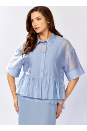 Блузка прямого силуэта с воротнтком стойкой, с коротким спущенным рукавом на манжете. Застежка по переду до талии на пели-пуговицы. По низу изделия баска, по переду настрочено декоративное кружево. Спинка удлиненная. Длина рукава 47см; Длина блузка 68см.