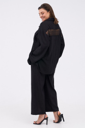 Льняной комплект, состоящий из объёмной рубашки и прямых брюк. Рубашка со спущенной линией плеча. Рукав длиной 7/8 с широкой подгибкой. По переду накладной карман с клапаном. По спинке вставка из полупрозрачного кружева. По бокам разрезы. Брюки на резинке по поясу спинки. Застёжка на гульфик с молнией и пуговицу. По бокам карманы. Длина брюк - 102,5 см.