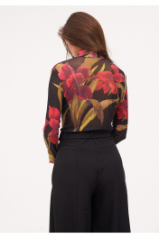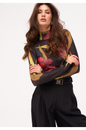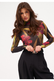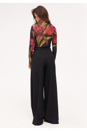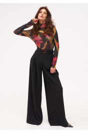 Комплект из двух предметов: джемпер и брюки. Джемпер облегающий из эластичной, прозрачной сетки в яркий принт. Брюки-палаццо с высокой посадкой по талии. Верх брюк фигурный. По переду вертикальные рельефы по центру и складки. В боковых швах карманы. Застёжка на потайную молнию спереди. Комплектуется текстильным ремнём с металлической пряжкой.