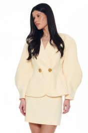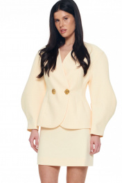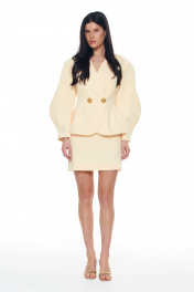 Костюм из плотной поливискозы состоящий из жакета и мини-юбки. Жакет на подкладке приталенного силуэта придаёт фигуре эффект песочных часов. Архитектурные рукава делают образ сложным и изысканным. Застежка на две большие золотые пуговицы. Юбка-мини на подкладке с застёжкой на потайную молнию сзади. Длина жакета 42-46р - 60,5см; Длина юбки 42-46р - 45см.